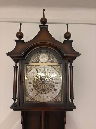 Elegante reloj de pared con un diseño clásico y detalles ornamentales. - Caja de madera oscura. - Esfera con números romanos y detalles dorados. - Péndulo visible. - Frontal de cristal.