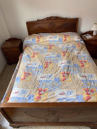 Se vende habitación completa estilo rústico antigua vintage formada por cama de 135, armario de tres puertas con espejo, mueble aparador buffet y dos mesitas. Todo de madera de muy buena calidad. Todo como nuevo, muy poco uso para los años que tiene. Medidas del armario: 1,85m alto x 1,55m ancho x 60cm profundo. Medidas mueble aparador buffet: 75cm alto x 1m ancho x 40cm profundo. Medidad mesitas: 60cm alto x 55cm ancho x 30cm profundo.