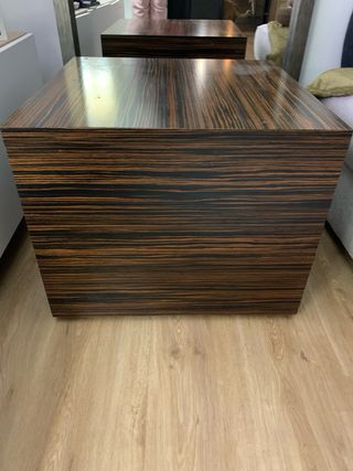 Elegante mesa de centro con un diseño moderno y acabado veteado. - Patrón de vetas oscuras y claras. - Superficie lisa y brillante. Tiene una pequeña mancha blanca que se hizo por poner una pizza valiente encima sin protección.suponfo que al darle cera se iria , es madera madera A mi me encanta es funcional con las ruedas que tiene pero en mi salón se ve muy grande ya que lo tenia antes en mi antigua casa y el salon era mas grande