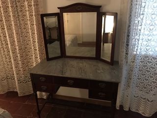 Conjunto de tocador antiguo con espejo y silla a juego. Piezas con un diseño clásico y detalles tallados. - Tocador con dos cajones - Espejo con marco decorado. - Silla con respaldo y asiento de madera.