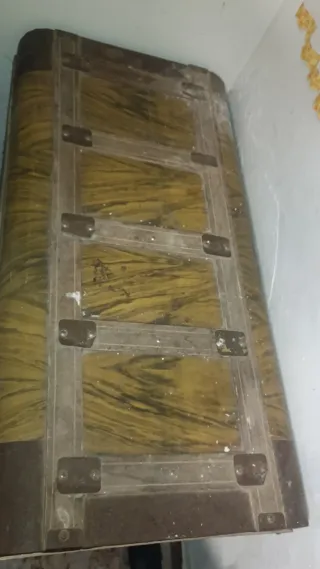 Precioso baúl antiguo de madera y metal, ideal para restaurar. Tiene un diseño clásico con detalles en amarillo y marrón. - Perfecto para un proyecto de restauración. - Presenta un estilo vintage muy atractivo. - Ideal como elemento decorativo.