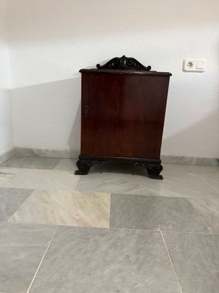 Preciosa mesita de noche con unos 75-80 años de antigüedad. Su diseño clásico la hace una pieza única. - Fabricada en madera. - Color marrón oscuro con detalles en negro. -madera totalmente sana, solo necesario restaurar.