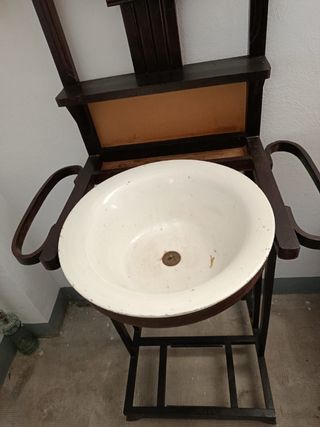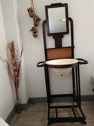 Preciosa pieza antigua de palanganero. Ideal para darle un toque vintage a tu baño o recibidor. - Lavabo de porcelana blanca. - Estructura de madera oscura, con espejo. - Perfecto estado de conservación.
