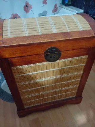 Este baúl combina materiales naturales para un toque rústico. - Diseño con tapa curva. - Panel frontal de bambú. - Detalles en madera oscura. - Adorno circular en la tapa.