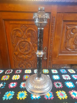 PRECIO NEGOCIABLE Elegante lámpara de pie de estilo antiguo, con un diseño clásico y ornamentado. - Fabricada en metal con acabados en dorado y plateado. - Base y cuerpo detallados con motivos decorativos. - Múltiples brazos para velas o bombillas.