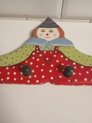 Original perchero de madera con diseño de payaso. Ideal para darle un toque divertido a cualquier habitación. - Pintura detallada. - Forma de payaso sentado con las piernas extendidas. - Cuatro ganchos para colgar objetos.