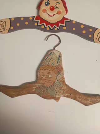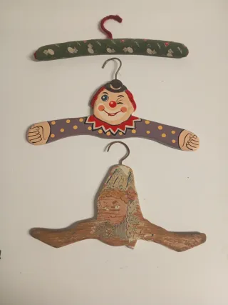 Conjunto de tres perchas antiguas con diseños únicos. - Una percha está cubierta de tela con un estampado de figuras. - Otra percha tiene forma de payaso pintado. - La tercera percha es de madera con una imagen de una mujer y detalles florales.