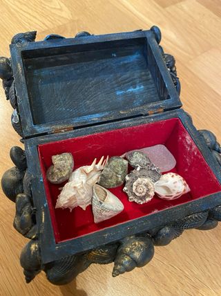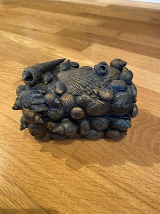 Precioso cofre decorado con una gran variedad de conchas marinas. Un detalle único para cualquier rincón. - Diseño elaborado con conchas. - Acabado en tonos dorados y marrones.