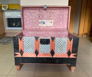 RECOGIDA EN GIJON Baúl antiguo de madera maciza con herrajes de metal remachados y patas torneadas, sólido y funcional. Marca/fábrica: Valeriano Fernández – Fábrica de Baúles (Albacete). Época aproximada: principios-mediados del siglo XX (1920–1940 aprox.). Usos: decorativo y para almacenaje (yo lo usaba así). Interior: forro original de época con estampado, marca visible (ver fotos). Estado: desgaste normal por uso y antigüedad, pátina auténtica; cerradura sin llave; el forro interior tiene marcas y pliegues de tiempo que no afectan su función. Agradezco ofertas honestas y bundles 😉