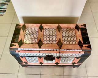Este baúl vintage presenta un interior forrado con una tela de estampado floral y motivos geométricos en tonos burdeos y azul. - Forro interior de tela con diseño. - Estructura de madera. - las medidas del anuncio no son exactas