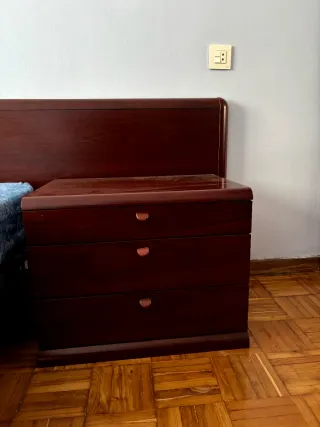 Conjunto de mesitas de noche y cabecero a juego. Usadas pero en buen estado, son de un piso antiguo. Medidas (ancho x alto x profundidad) Mesitas: 60×47x42 (cm) Cervecero: 278x76x4'5 (cm)