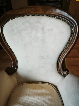 - Estructura de madera robusta. - Tapicería de tela que habría que cambiar. - Diseño de respaldo curvo y brazos elegantes.