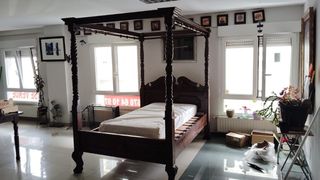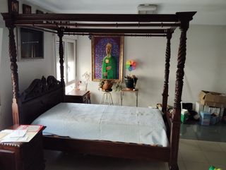 Oportunidad. Cama colonial de dosel, con barra y argollas y estructura de madera con somier nuevo. Acompañada de dos mesitas y un sifonier con espejo abatible. Medidas cama : Ancho 1,40m x Largo 1,90m x Alto 2,11m - Diseño de madera tallada. - Estructura robusta y elegante.