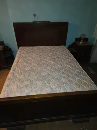 Conjunto de dormitorio antiguo de castaño, con un diseño clásico y elegante. - Muebles de madera maciza. - Acabado en tono marrón cálido. - Incluye mesitas de noche y cabecero. URGE VENTA POR REFORMA