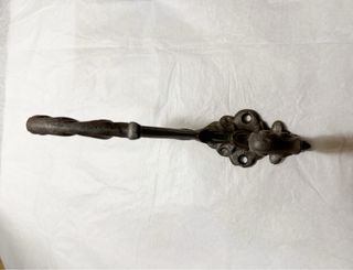 Este calentador de camas antiguo presenta un diseño clásico y funcional. - Tapa metálica con perforaciones decorativas. - Asa de madera con detalles ornamentales. - Elemento decorativo de latón en la unión del asa.