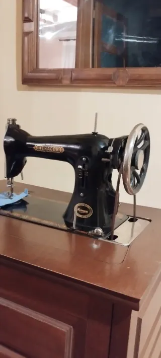 Máquina de coser antigua de la marca Singer Mod.Hexagon, un modelo clásico para coleccionistas o amantes de la costura. Con mueble de madera maciza tallado y espejo a juego en perfectas condiciones. - Diseño vintage en color negro y dorado. - Base de madera y costurero. - Detalles metálicos.