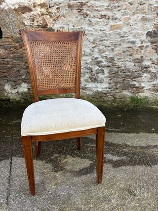 Conjunto de seis sillas antiguas con un diseño clásico y elegante. -Dos silla cuenta con reposabrazos. - Respaldo de rejilla. - Asiento tapizado.