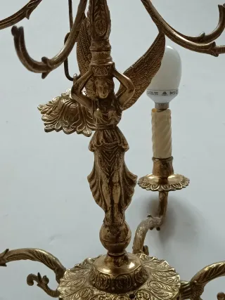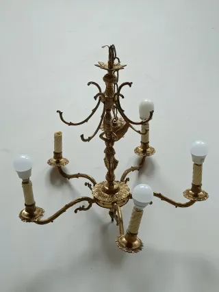 *Antigua lámpara de estilo candelabro con un acabado dorado. *Estuvo en el piso que vamos a reformar toda la vida y funcionó hasta que la sacamos (por lo que entiendo que sigue funcionando, incluídas las bombillas). *Está tal cual ves en las fotos. Estamos reformando, por lo que, aunque esté guardada y le quite el polvo, nunca queda perfecta. *Creo que le haría falta algún arreglo en algún candelabro. Necesita algo de amor. *Artículo para anticuarios o coleccionistas, o para alguien que quiera un artículo especial. *Tiene un diámetro de unos 50cm aproximadamente. *Si necesitas más fotos y/o información, no dudes en escribirme!
