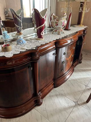 Elegante aparador antiguo con detalles en madera y cristal. Su diseño curvo y ornamentado le da un toque clásico a cualquier estancia. - Acabado en tonos marrones y dorados. - Patas talladas. - Tiradores ornamentados. !! falta una “anilla” en uno de los pomos ( foto)