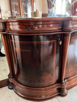 Mueble de salón de madera maciza con un diseño clásico y elegante. - Acabado en tono madera natural. - Cuenta con estantes y cajones. - Tiradores dorados envejecidos. - Base robusta. Se regala mesa antigua del mismo estilo.
