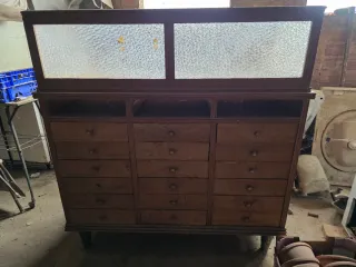 Antigua cajonera mostrador de farmacia. En las fotos se ve con polvo pero esta en buen estado, la faltan un par de tiradores. Tiene muchos cajones. Pieza dificil de encontar.