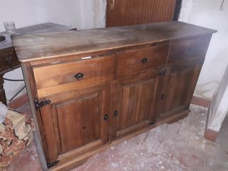 Mueble aparador de estilo castellano antiguo, con un diseño robusto y detalles tallados. - Tres cajones superiores con tiradores ornamentales. - Tres puertas inferiores con paneles tallados. - Patas de madera maciza.