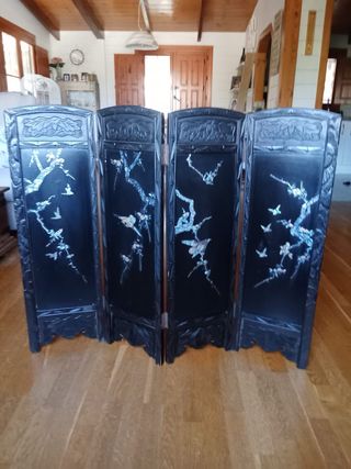 Elegante biombo oriental de estilo antiguo, perfecto para dividir espacios con un toque de distinción. - Diseño con incrustaciones de nácar y detalles tallados. - Estructura de madera robusta. - Paneles decorados con motivos florales y aves.