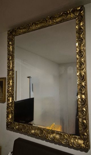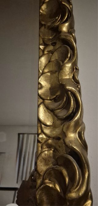 Elegante espejo antiguo con un marco de madera tallada y acabado en pan de oro. Su diseño clásico aporta un toque de distinción a cualquier espacio. - Marco con detalles ornamentales. - Acabado dorado envejecido. Elegante espejo con marco de madera tallada y acabado en pan de oro. - Marco con detalles. -Cristal viselado. - Diseño clásico y lujoso. -126cm de ancho, 164cm alto y 8cm ancho. -No se envía, recogida en mano. 1.500€