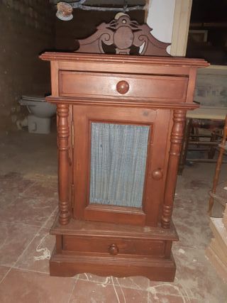 Mesita de noche antigua con un diseño clásico y elegante. hay dos disponibles ,precio por unidad - Fabricada en madera.medidas 75 alto x 45 ancho x 38 fondo - Detalle de tela en la puerta. - Cajón superior e inferior con tirador.
