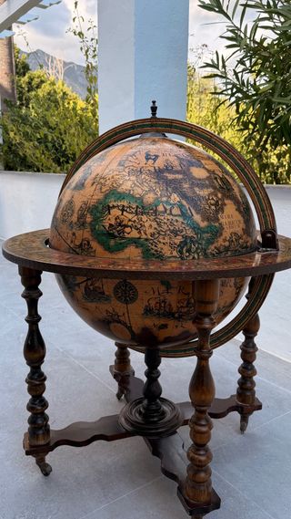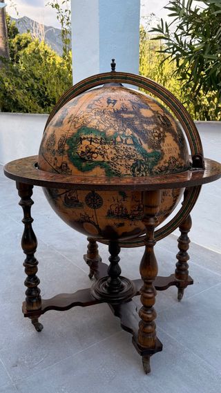 Este mueble bar con forma de globo terráqueo añade un toque clásico y elegante a cualquier espacio. - Diseño detallado con mapas antiguos. - Base de madera robusta.