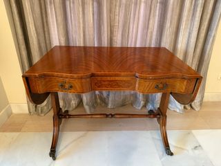 Elegante mesa consola antigua estilo George III, con hojas abatible. Perfecta para espacios reducidos o como superficie adicional. - Fabricada en madera "flame Veneer". - Acabado en tono marrón cálido. - Patas con detalles ornamentales con ruedas. - 3 cajónes, 2 con tiradores.