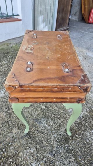 Original mesa auxiliar creada a partir de una maleta vintage. Un mueble único con un toque retro. - Base de cuatro patas curvas en color verde. - Maleta con detalles metálicos y cierres.
