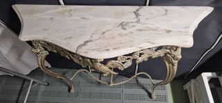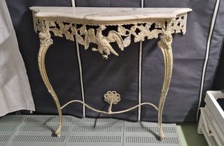 Elegante taquillón antiguo con tapa de mármol y estructura de metal. - Diseño con águila y detalles ornamentales. - Patas curvas con adornos. - Pie central decorativo.