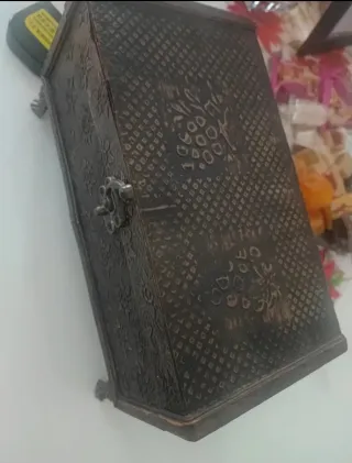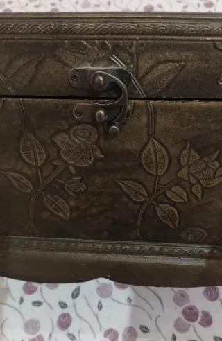 Este baúl antiguo es una pieza decorativa con un diseño intrincado. 2 diferentes 1 madera y 1 metálico Por separafo 10 unidad NEGOCIABLE - Acabado en tonos marrones y dorados. - Elaborado con una combinación de metal y madera. - Presenta un cierre metálico decorativo. - Patas pequeñas y ornamentadas en la base.