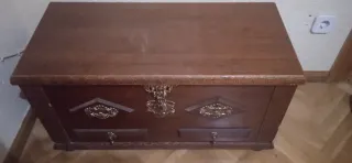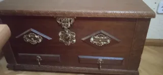 Baúl de madera con detalles ornamentales dorados. - Diseño clásico y elegante. - Frontal con dos cajones. - Tiradores metálicos. - Adornos tallados en la base y el borde superior.
