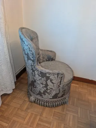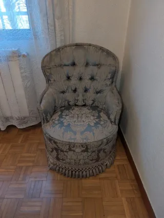 Elegante sillón antiguo estilo Luis XV, también conocido como descalzadora. Su diseño clásico y tapizado detallado lo convierten en una pieza única. Estilo: Clásico con respaldo capitoné y base con flecos de pasamanería. Estado: Tapicería original con motivos florales en tonos azulados y grises, muy bien conservada. Dimensiones: Tamaño compacto (aprox. 80-90 cm de altura), perfecta para dormitorios o como pieza auxiliar. Detalle: Estructura robusta y muy cómoda. Aporta un toque señorial a cualquier estancia.