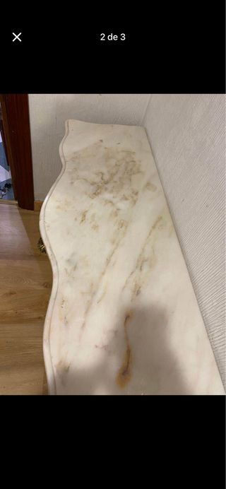 Elegante cómoda antigua con un diseño clásico y detalles ornamentales. Piedra encimera en perfecto estado. Envío solo recogida a domicilio. - Encimera de mármol veteado. - Estructura principal de madera. - Tiradores dorados con motivos. - Puertas inferiores con ornamentación tallada.