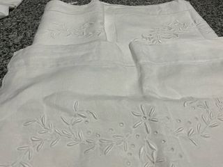 Sábanas antiguas de lino, bordadas con un diseño clásico. Usadas. Medidas: Entre 240 y 260 cm de largo, y entre 170 y 180 cm de ancho. Cada una de ellas se vende por 15 €, entrega en mano.