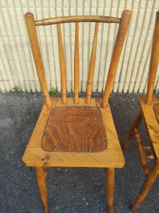 Conjunto de sillas de madera con un diseño clásico y rústico. - Asiento de madera con remaches. - Patas cónicas. - Respaldo con varillas. - Dispongo de 6 unidades en buen estado,alguna de ellas tiene resto de pintura pero fácil de quitar 4 están en buen estado y dos de ellas tienen agrietado asiento,esas 2 al que compré el lote de 4 las regalo. - precio unidad 15€ - Medidas - Ancho 36,5 - Fondo 38 - Alto 90