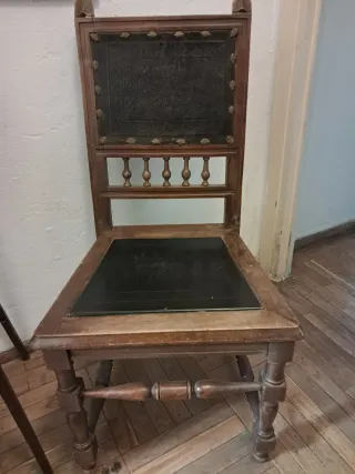 Elegante silla antigua con detalles ornamentales. - Respaldo con panel de cuero repujado. - Asiento con panel de cuero negro. - Estructura de madera robusta. - Patas torneadas y travesaño decorativo.