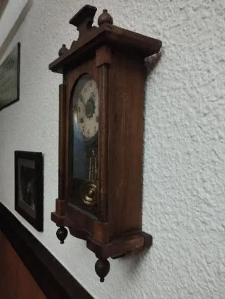 Elegante reloj de pared con un diseño clásico y detalles ornamentales. - Caja principal de madera oscura. - Esfera dorada con números romanos. - Detalles metálicos en la parte superior y a los lados. - Péndulo y pesas visibles en la parte inferior. Ver y recoger en Gijón
