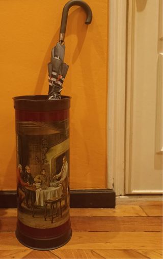 Antiguo paragüero con ilustración de cuadro inglés. En latón y con su borde superior y parte baja en plástico para protegerlo del oxido por el agua de los paraguas. Es de los años 60/70, presenta marcas y alguna rayadura del tiempo. También alguna en su interior. No tiene abollados. 48 cms de alto x 20.