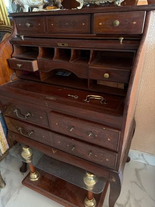 Elegante mueble secreter de estilo antiguo, perfecto para añadir un toque clásico a tu hogar. Su diseño atemporal lo convierte en una pieza destacada. - Fabricado en madera de alta calidad. - Acabado en tono cálido. - Cajones y puertas con tiradores decorativos. - Incluye detalles ornamentales en la tapa. Precio negociable