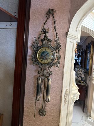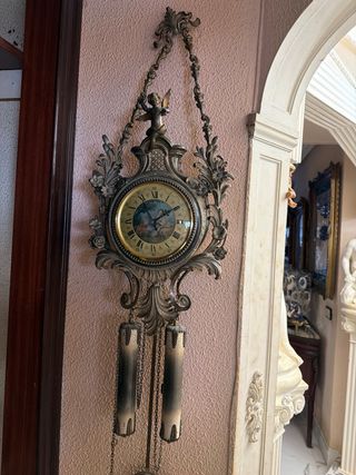 Elegante reloj de pared antiguo con un diseño colgante. - Elaborado en metal y madera. - Acabado en tonos dorados y plateados. - Detalle de querubín en la parte superior. - Incluye dos péndulos decorativos. Ver y recoger en Gijón