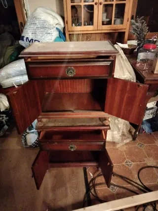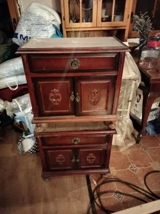 Se venden dos mesitas de noche antiguas, perfectas para añadir un toque clásico a tu hogar. - Fabricadas en madera. - Color marrón oscuro. - Diseño con cajón y puertas. - Tiradores ornamentados. Ideales para restaurar Precio por la dos mesitas