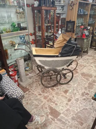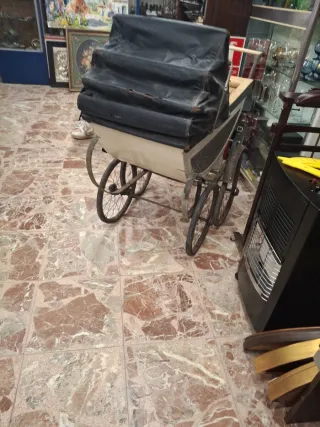 Este carrito de bebé antiguo tiene un diseño clásico y elegante. - Estructura de metal y madera. - Cesta de tela. - Ruedas grandes para facilitar el movimiento.