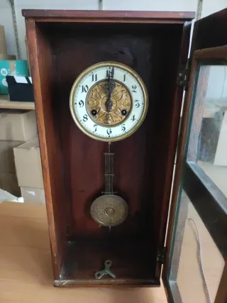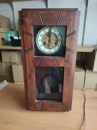 Este es un reloj de pared antiguo con un diseño clásico. Tiene un desperfecto en lateral puerta se ve en foto Mide 59 x 28 x24. Desconozco si funciona,años 50 o 60 - Marco de madera. - Frontal de cristal. - Detalles decorativos tallados en la madera.