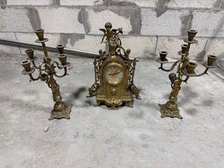 Conjunto de un reloj de sobremesa y dos candelabros, todos con un diseño clásico y ornamentado. - Reloj de sobremesa con detalles intrincados. - Dos candelabros a juego con capacidad para varias velas. - Piezas decorativas con un acabado dorado.