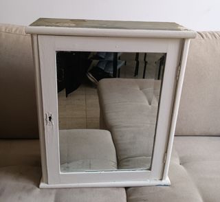 Armario Botiquín antiguo de madera y cristal, ideal para baño o tocador. Tiene un espejo y un estante de cristal en su interior. El mueble presenta un estilo vintage con la pintura desgastada en algunas zonas, lo que le da un encanto especial. Fabricado en los años 30. Perfecto para retocar o lucir con esa patina única que le proporciona el paso del tiempo. - Medidas compactas, perfecto para espacios reducidos. - Puerta con cierre. - Estante de cristal interior.