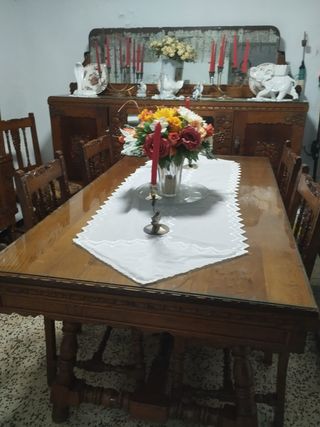 Precioso juego de comedor antiguo de estilo canario. Se compone de una mesa con sobre de cristal y seis sillas. También se incluye un aparador con vitrina. Las piezas presentan un hermoso trabajo de talla en madera. Son muebles robustos y con mucha presencia. - Mesa de comedor con sobre de cristal. - Seis sillas de madera tallada. - Aparador con vitrina de cristal.
